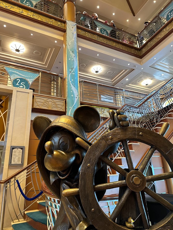 In celebration of the anniversary, the ship’s lobby was festooned with special decorations. The portholes along decks 3 and 4 midship were also specially decorated with the 25th anniversary logo. The lobby had a special cutout of the ships with the logo that made for a really fun photo-op, with Disney photographers available most nights to capture a special family memory. Unfortunately, because we were on one of the later anniversary sailings, a lot of the merchandise Disney had teased early on was sold out. The special ears (which you can now purchase on ShopDisney), the loungefly, the pin and the mug were not available for our sailing. The ornament, spirit jersey, and all of the jewelry items were still available. The new 2023 general DCL merch was available including the plush ears and crossbody bag that my daughter and I had to have.